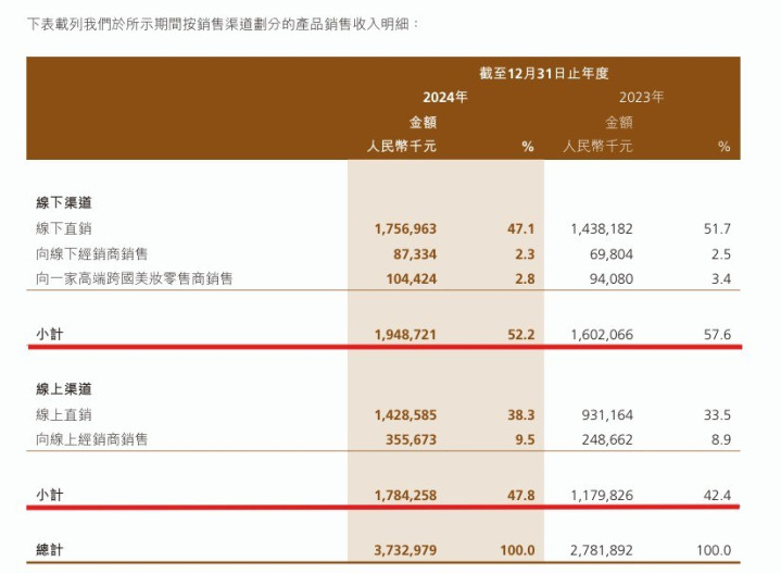 公司的线下渠道包括自营专柜、一家高端跨国美妆零售商(丝芙兰)及线下经销商。公司的自营专柜布局于国内高端百货商店中,是公司的一块稀缺的资产。公司坚持体验式营销策略,专柜均设有专门的化妆台,由精通化妆知识和技能的训练有素的美妆顾问提供支持,为消费者提供专业的试妆,凸显产品效果。截至2025年6月30日,公司在全国各地的专柜配备了超过3100名美妆顾问,是中国所有国货及国际美妆品牌中最大的专柜服务团队之一。
